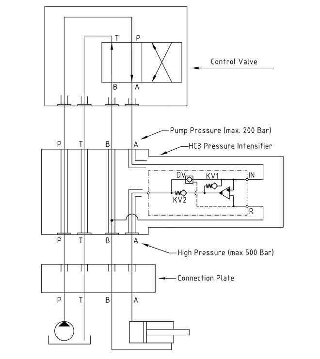 Temel işlem, fonksiyon diyagramında gösterilmiştir. Yağ, bağlantı plakasından kontrol vanasına, kontrol vanasına, kontrol vanasına, kontrol vanasından KV1, KV2 ve DV'den yüksek basınçlı bağlı H'ye serbestçe akarak beslenir. Yüksek basınçlı taraftan H yağı, bağlantı plakasına A portuna beslenir. Bu durumda, güçlendiriciden maksimum akış, hızlı bir ileri fonksiyon sağlar. Yüksek basınçlı H'ye pompa basıncına ulaşıldığında, vanalar KV1, KV2 ve DV kapanacak. Son basınç, salınımlı pompa ünitesi OP tarafından sağlanacaktır. Ünite, yüksek basınç tarafındaki son baskıya ulaşıldığında otomatik olarak duracaktır. Yüksek basınç tarafında tüketim veya sızıntı nedeniyle basınç düşüşü olursa, OP valfi son basıncı korumak için otomatik olarak çalışır.