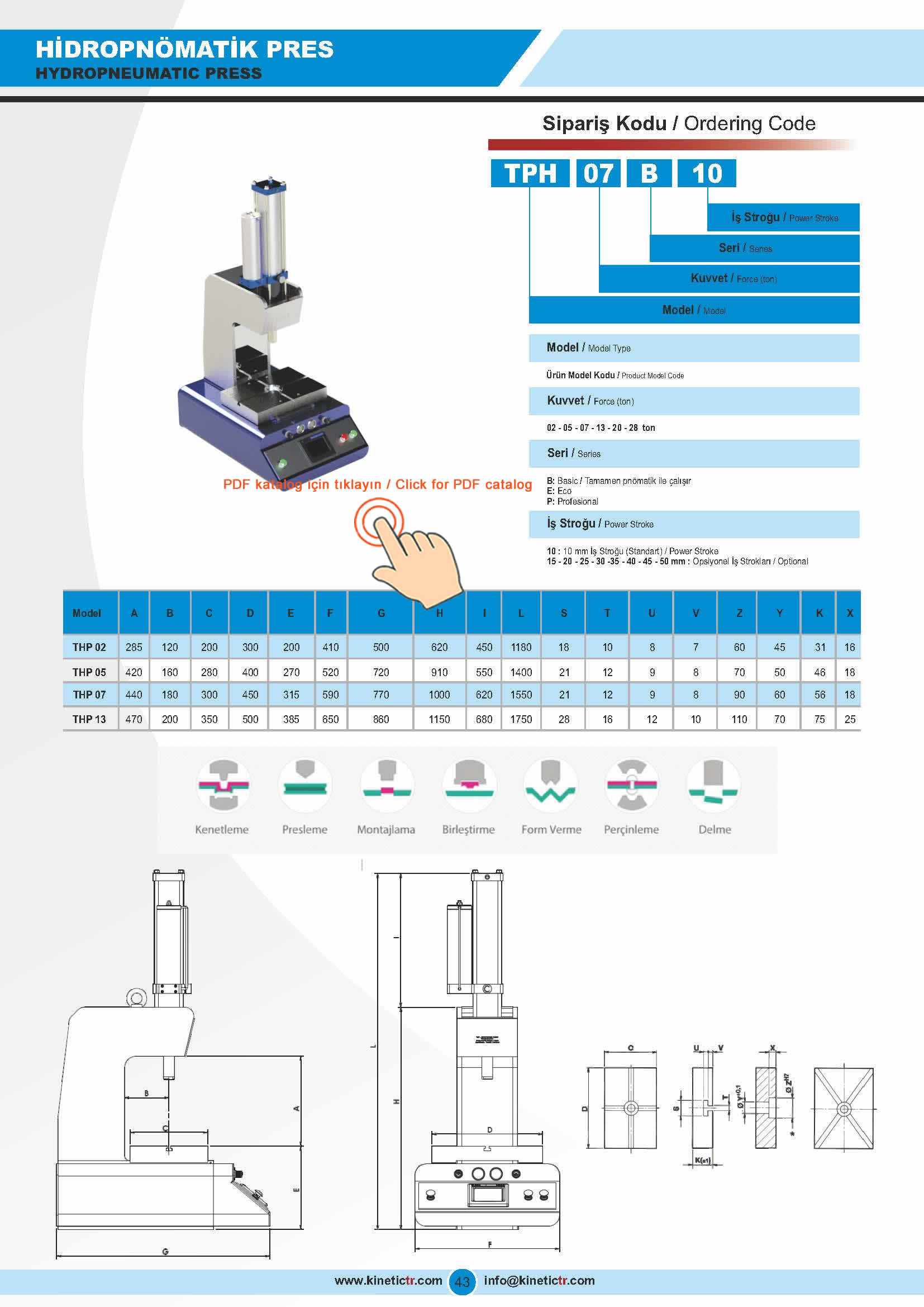 Hidro Pnömatik Presler, pnömatik hava basıncı ile (7 bar) yüksek kuvvetler elde edilmesini sağlayan hibrit bir sistemdir diyebiliriz. Pnömatik kuvvetinin yetmediği durumlarda 7 bar hava ile 70-80 ton kuvvetler elde mümkündür. Kısacası pnömatik kuvveti hidrolik kuvvetine çeviririler. Temizdirler, fazla bakım gerektirmez, enerji tasarrufu sağlarlar, montajı kolaydır. Labarotuar ortamlarında test, deney amaçlı kullanımları yaygındır. Burç çakma, pim çakma, montajlama, presleme, ezme, bükme, kenetleme, bükme, kopartma, delik delme, birleştirme gibi birçok amaçla hidropnömatik presleri kullanabilirsiniz. Test preslerinde detaylı raporlamalar alınabilir. Dayanım kuvveti, kopma kuvveti, esneme miktarı gibi birçok test de yapılabilir. https://rohhman.com/hidro-pnomatik/hidro-pnomatik-silindir/thp-hidro-pnomatik-pres/ |