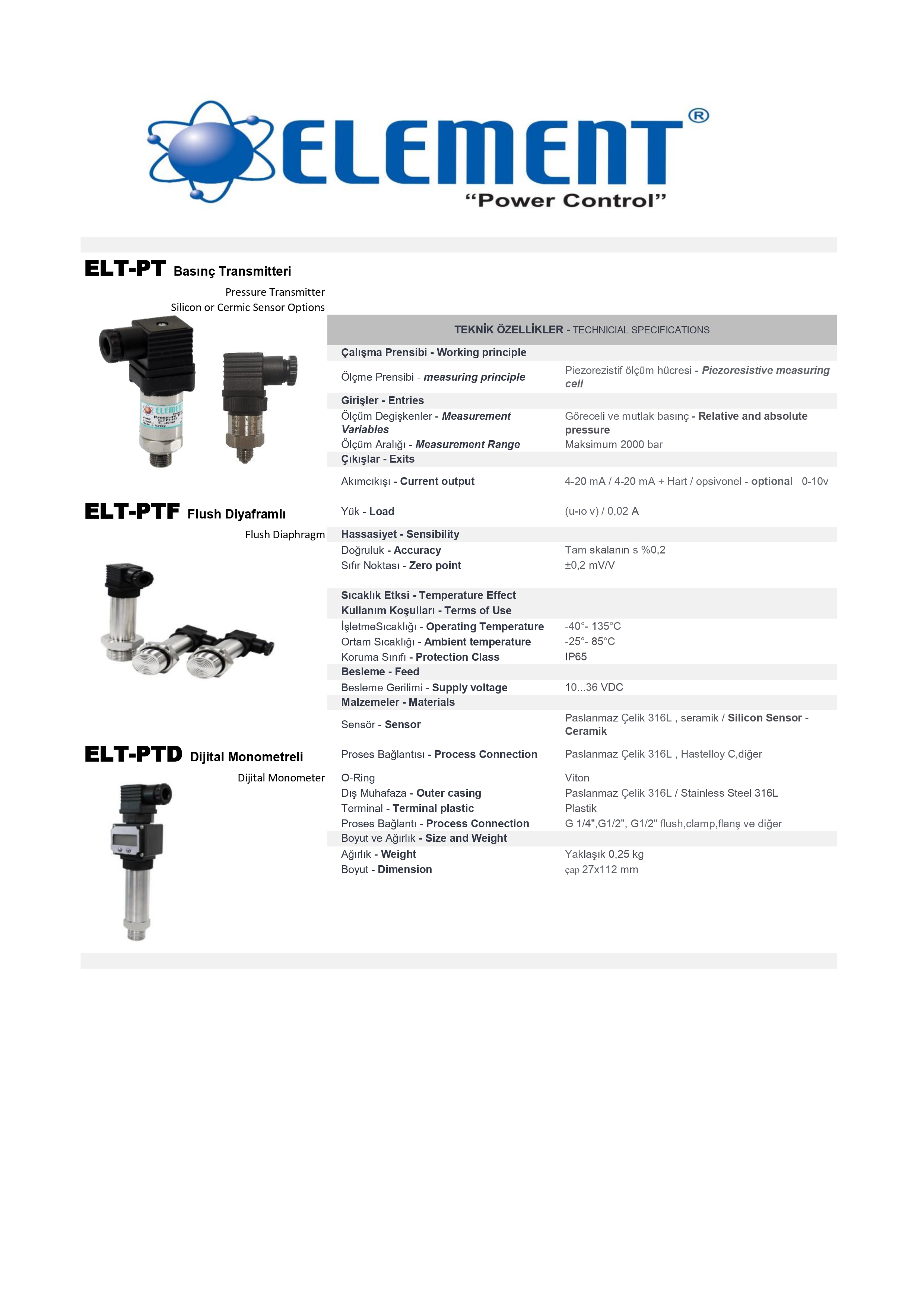 Element Silikon sensörlü basınç transmitterleri, genelde hidrolik makinelerde yağ basıncı ölçümü ve frekans konvertörlü pompa ve hidroforların su basınç ölçeri olarak kullanılır. Silikon sensörlü ürünler Hidrolik makinelerde özellikle tavsiye edilir.
