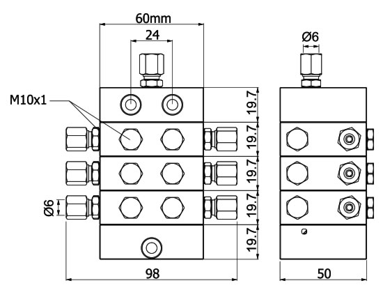 Progresif dağıtıcılar, modüler yapıya sahip dilimler ile bir araya getirilirler. Her dağıtıcı bloku en az 3 ve en fazla 9 ara dilimin bir araya getirilmesi ile oluşturulmaktadır. Aşağıdaki resim, 6 çıkışa sahip 3 ara dilimli bloku temsil etmektedir. Dilim sayısı arttırıldığında, her dilim için aşağıda belirtilmiş olan dilim ölçüsü (15mm) ilave edilerek blok yüksekliği hesaplanır.