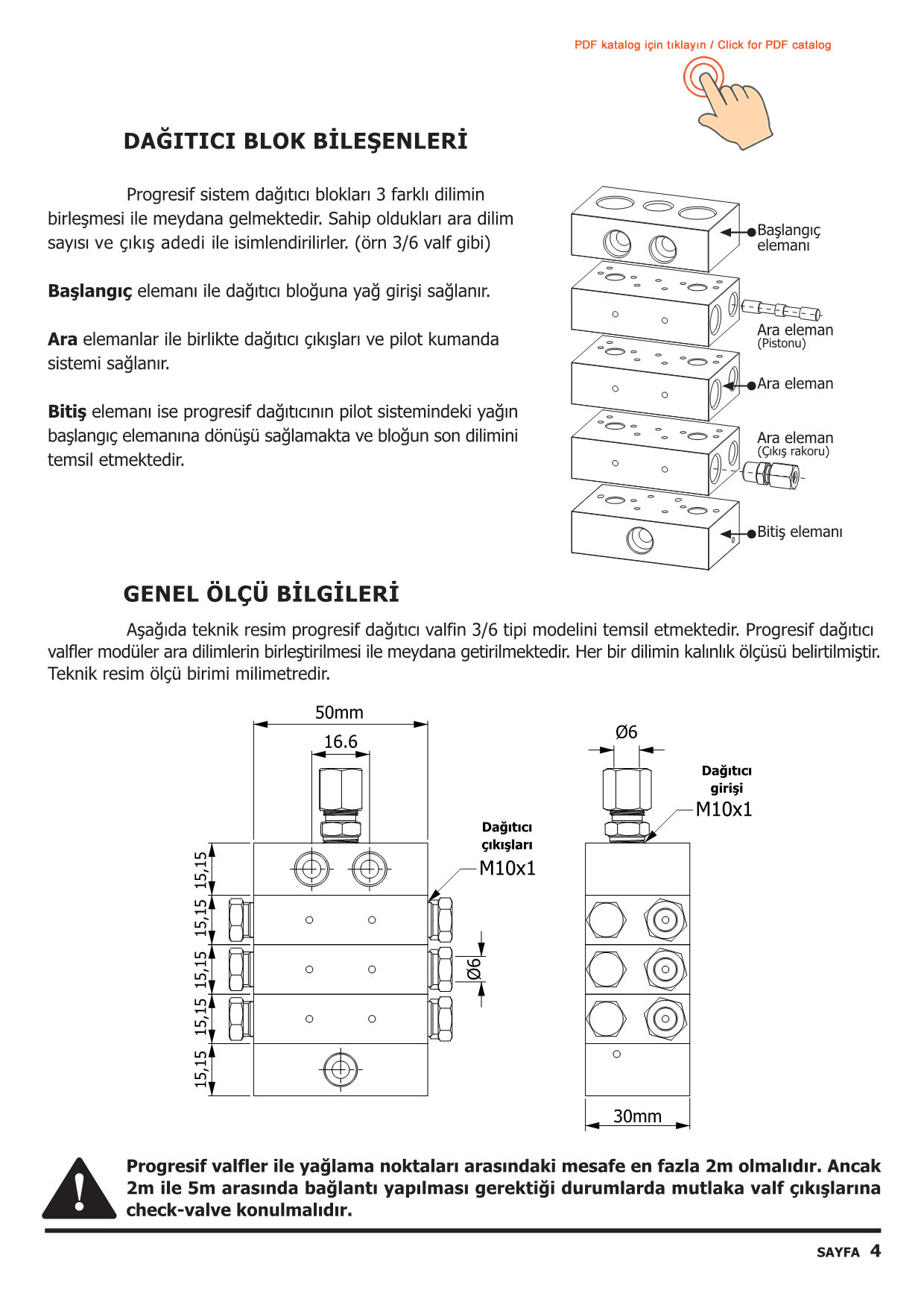 UYARI : Progresif dağıtıcılar ile yağlama noktaları arasındaki mesafe en fazla 5 metre olmalıdır. Ancak dağıtıcı çıkışlarında check-valve kullanarak bu mesafe 10 metre`ye kadar uzatılabilir.
